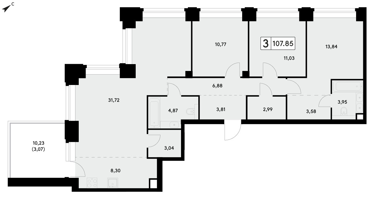 Комфортная трехкомнатная квартира квартира площадью 115.58 м² без отделки. Лот расположен на 35 этаже, корпуса 3 жилого комплекса «NOVA» (Нова).Комплекс находится по адресу: г. Москва, 5-й километр МЖД Киевское, земельный участок 5/3, срок сдачи 2027г.. Это соединение удобной инфраструктуры городской застройки и зеленых зон отдыха.