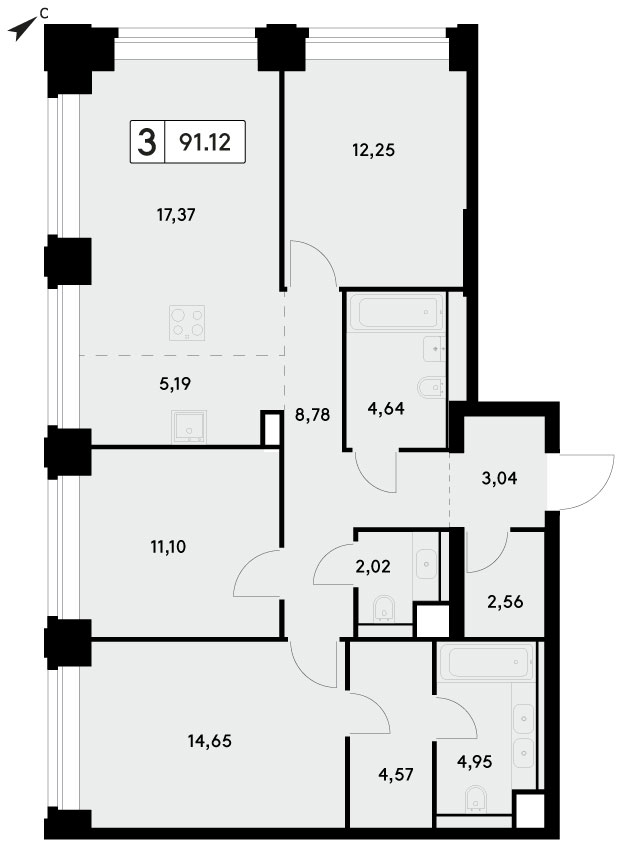 Трехкомнатная квартира 91.12 м², 24 этаж, ЖК «НОВА» (NOVA)