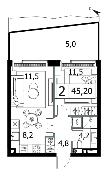 Двухкомнатная квартира №902, 44.2 м², 21 этаж, Жилой комплекс «PRIDE» (Прайд)