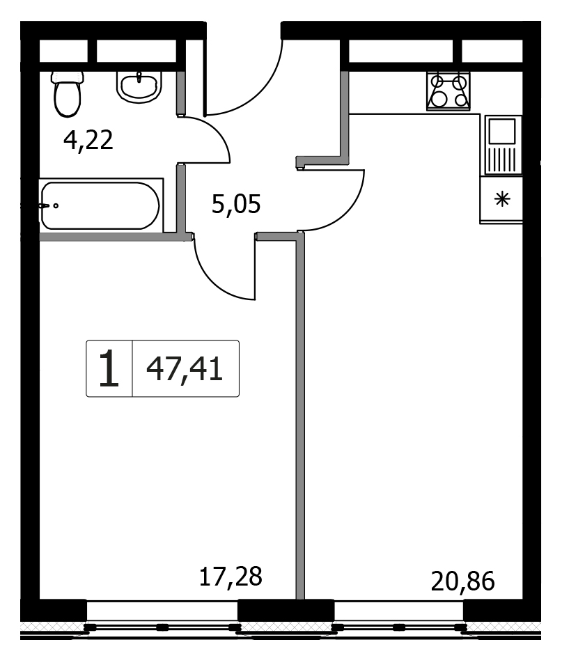 Однокомнатная квартира №44, 46.5 м², 10 этаж, Жилой комплекс «Городские истории»