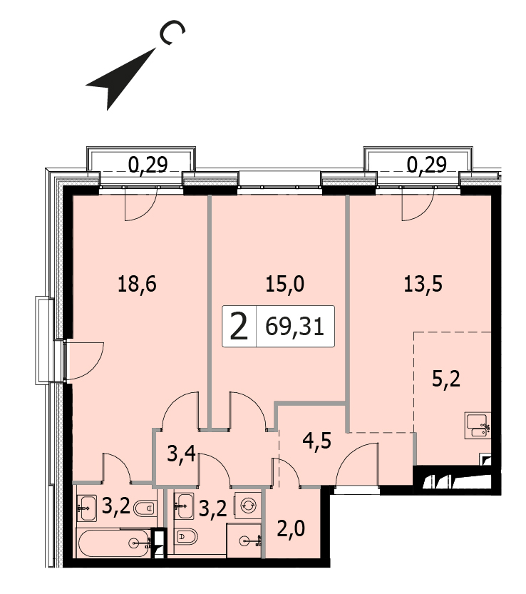 Двухкомнатная квартира 69.77 м², 4 этаж, ЖК «Селигер Сити»