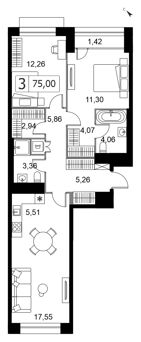 Двухкомнатная квартира №10852, 73.25 м², 7 этаж, Жилой комплекс «LIFE Варшавская»