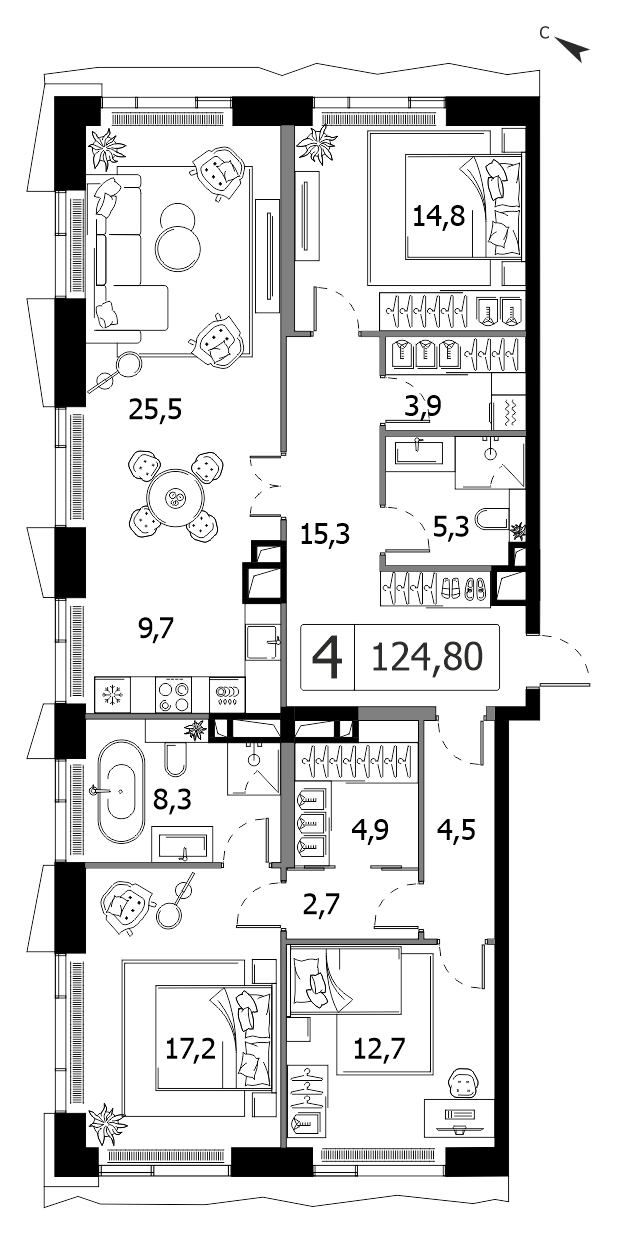 Четырехкомнатная квартира №843, 120.6 м², 15 этаж, Жилой комплекс «PRIDE» (Прайд)