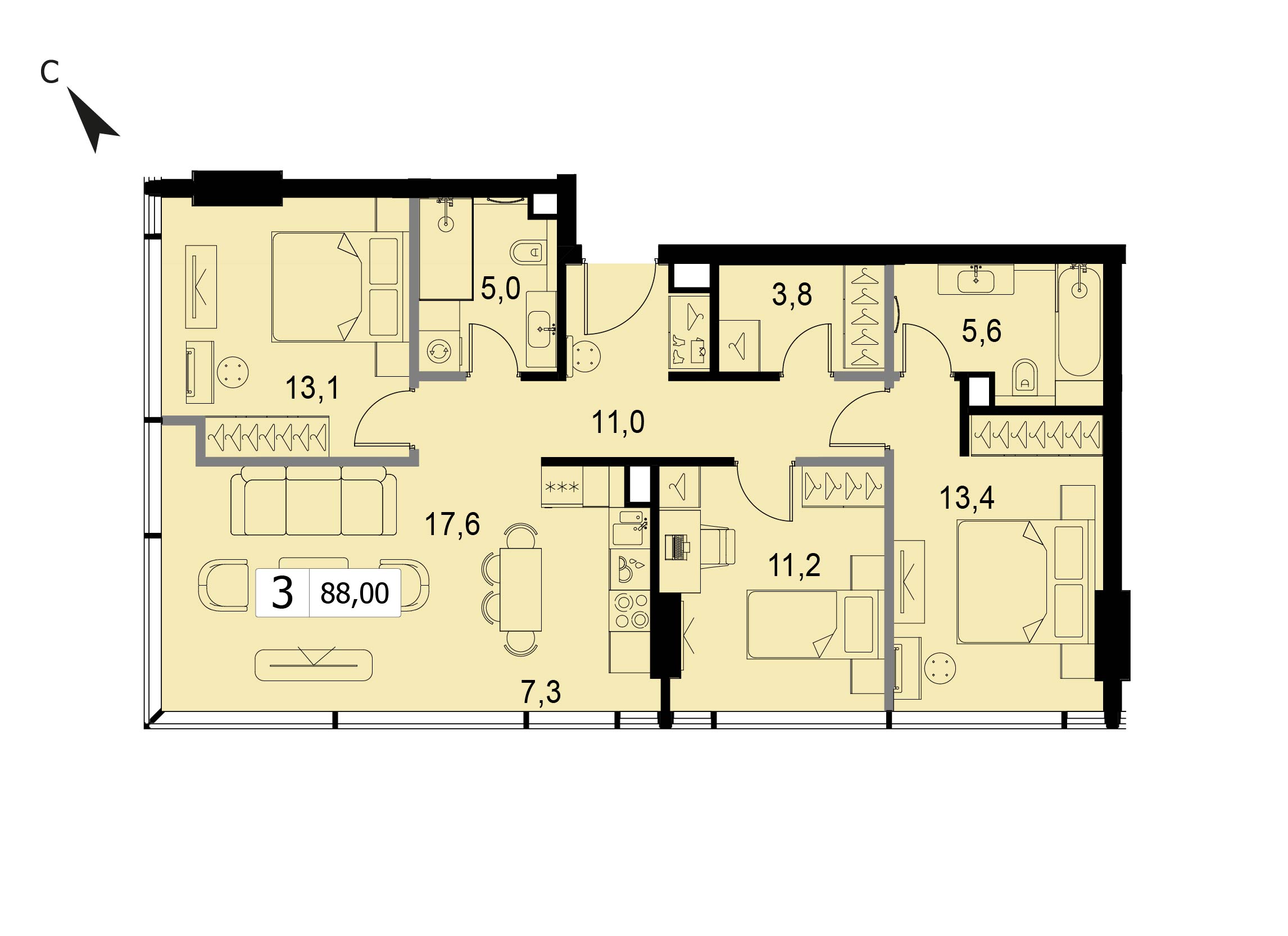 Трехкомнатная квартира 92.2 м², 20 этаж, МФК «СЛАВА» (SLAVA)