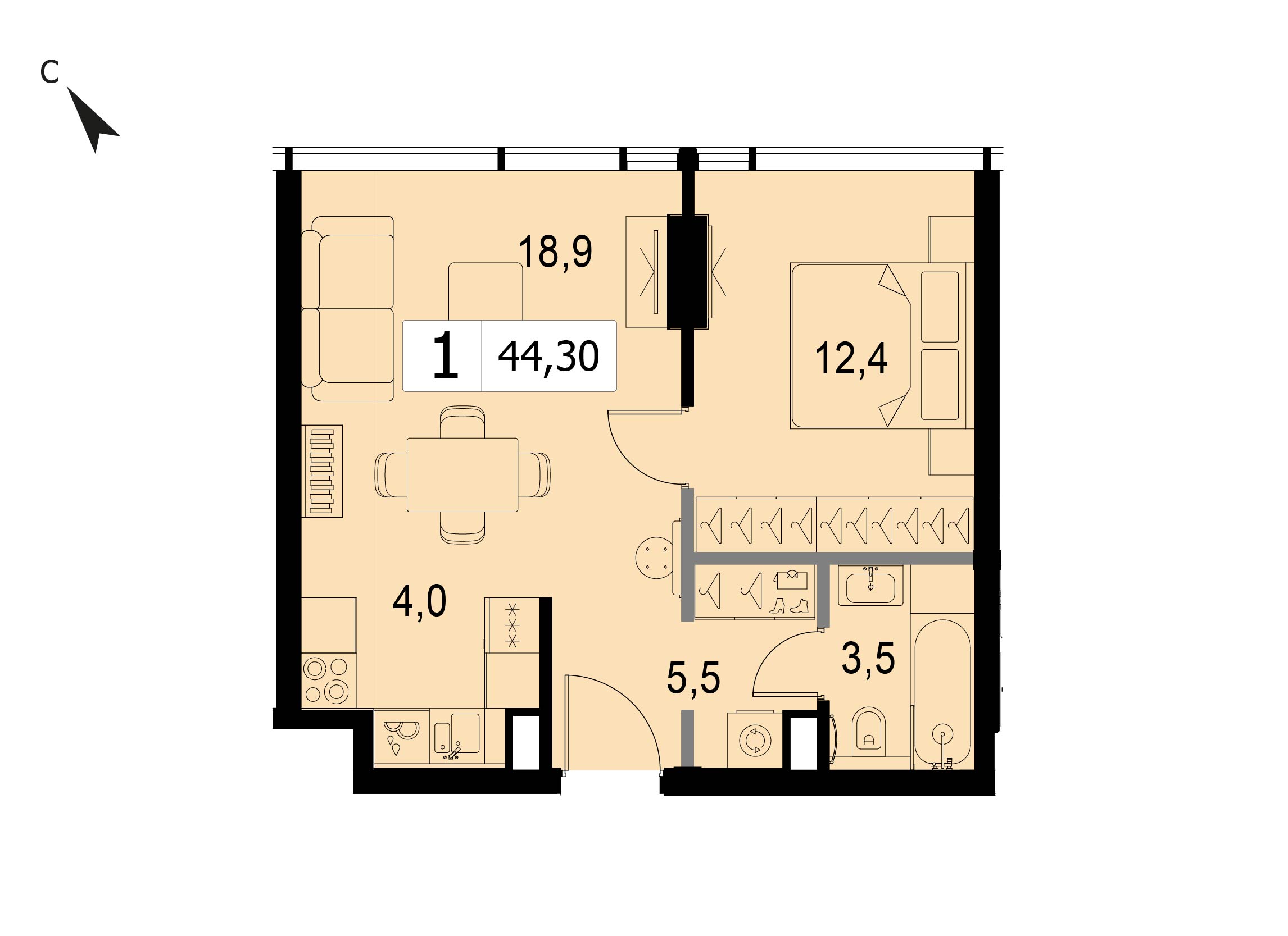 Однокомнатная квартира 41.2 м², 3 этаж, МФК «SLAVA» (Слава)