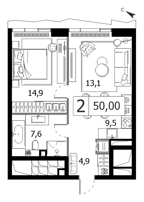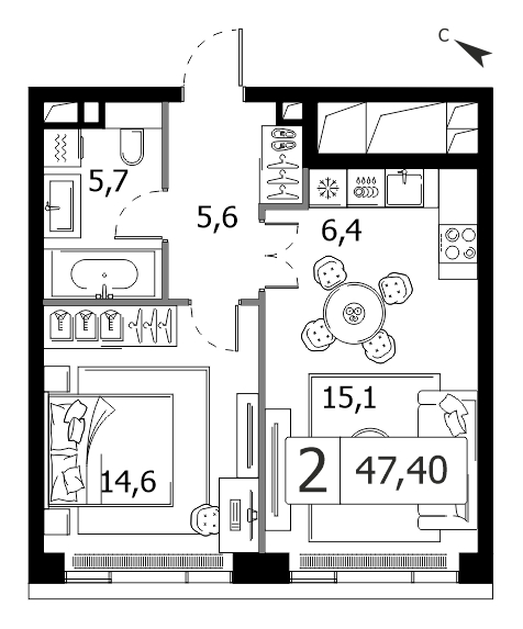 Двухкомнатная квартира №19, 47.4 м², 6 этаж, Жилой комплекс «PRIDE» (Прайд)