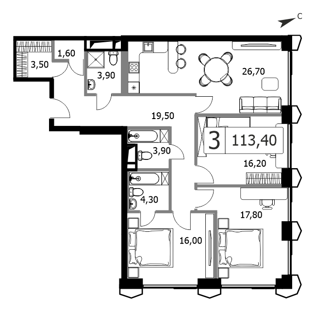 Четырехкомнатная квартира №1054, 111.4 м², 31 этаж, Жилой комплекс «Will Towers» (Уилл Тауэрс)