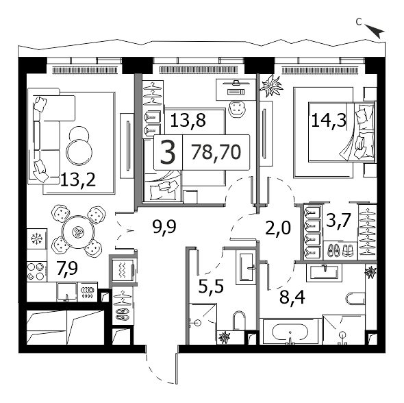 Трехкомнатная квартира №234, 75.8 м², 2 этаж, Жилой комплекс «PRIDE» (Прайд)