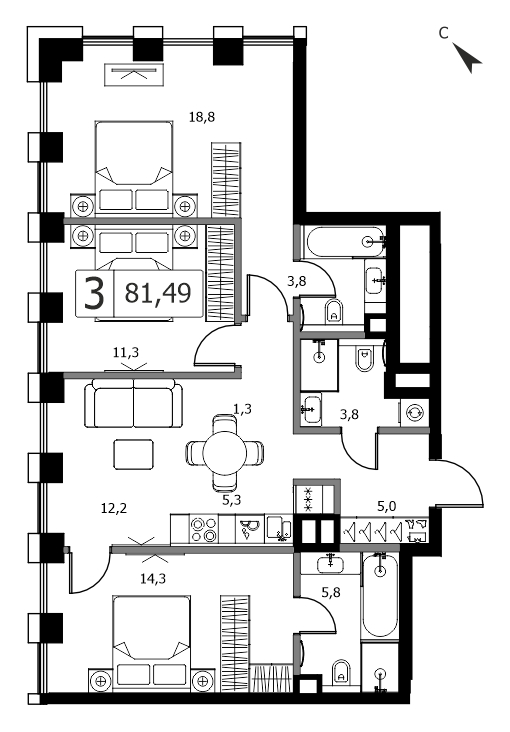 Трехкомнатная квартира №473, 82.7 м², 52 этаж, Жилой комплекс «CITY BAY» (Сити Бэй)