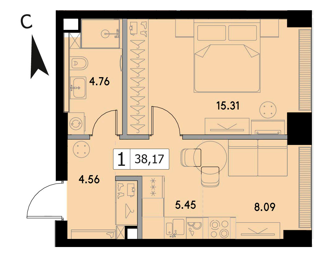 Однокомнатная квартира 42.6 м², 13 этаж, ЖК «ВЕЕР» (VEER)