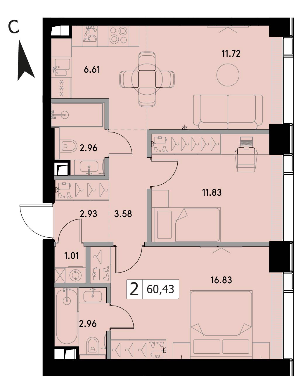 Двухкомнатная квартира 63.5 м², 20 этаж, ЖК «ВЕЕР» (VEER)