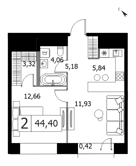 Однокомнатная квартира №3242, 42.93 м², 2 этаж, Жилой комплекс «LIFE Варшавская»