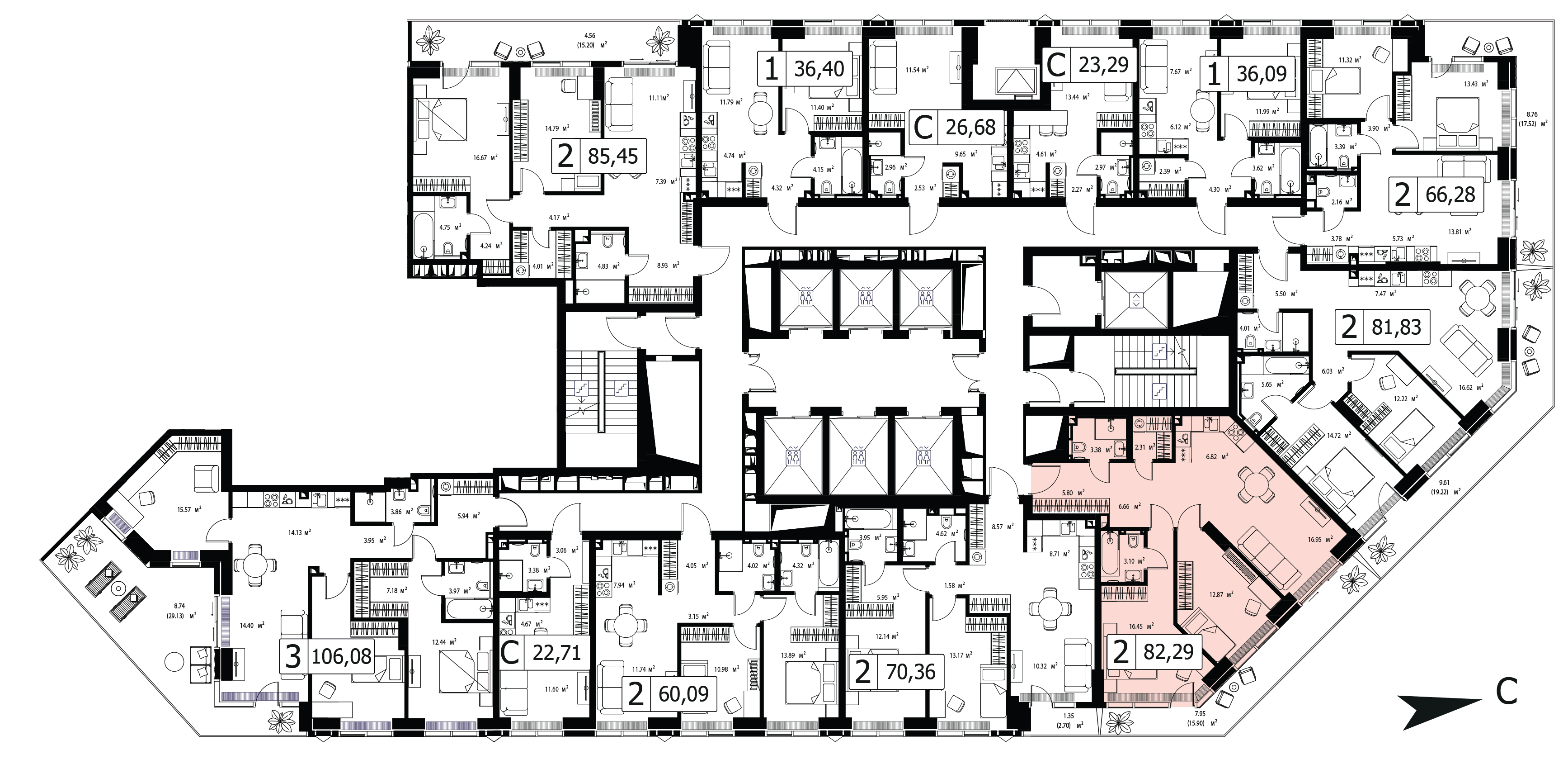 Двухкомнатная квартира №11111, 82.29 м², 11 этаж, «JOIS» (Джойс)