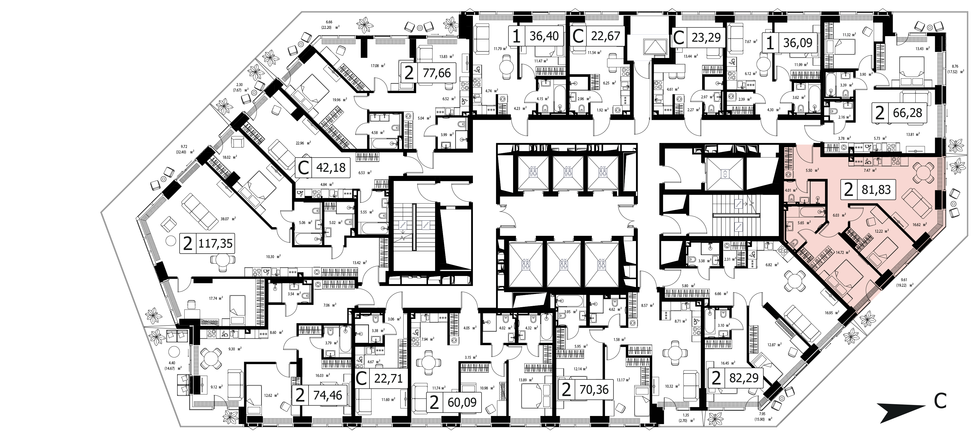 Двухкомнатная квартира №11412, 81.83 м², 14 этаж, «JOIS» (Джойс)