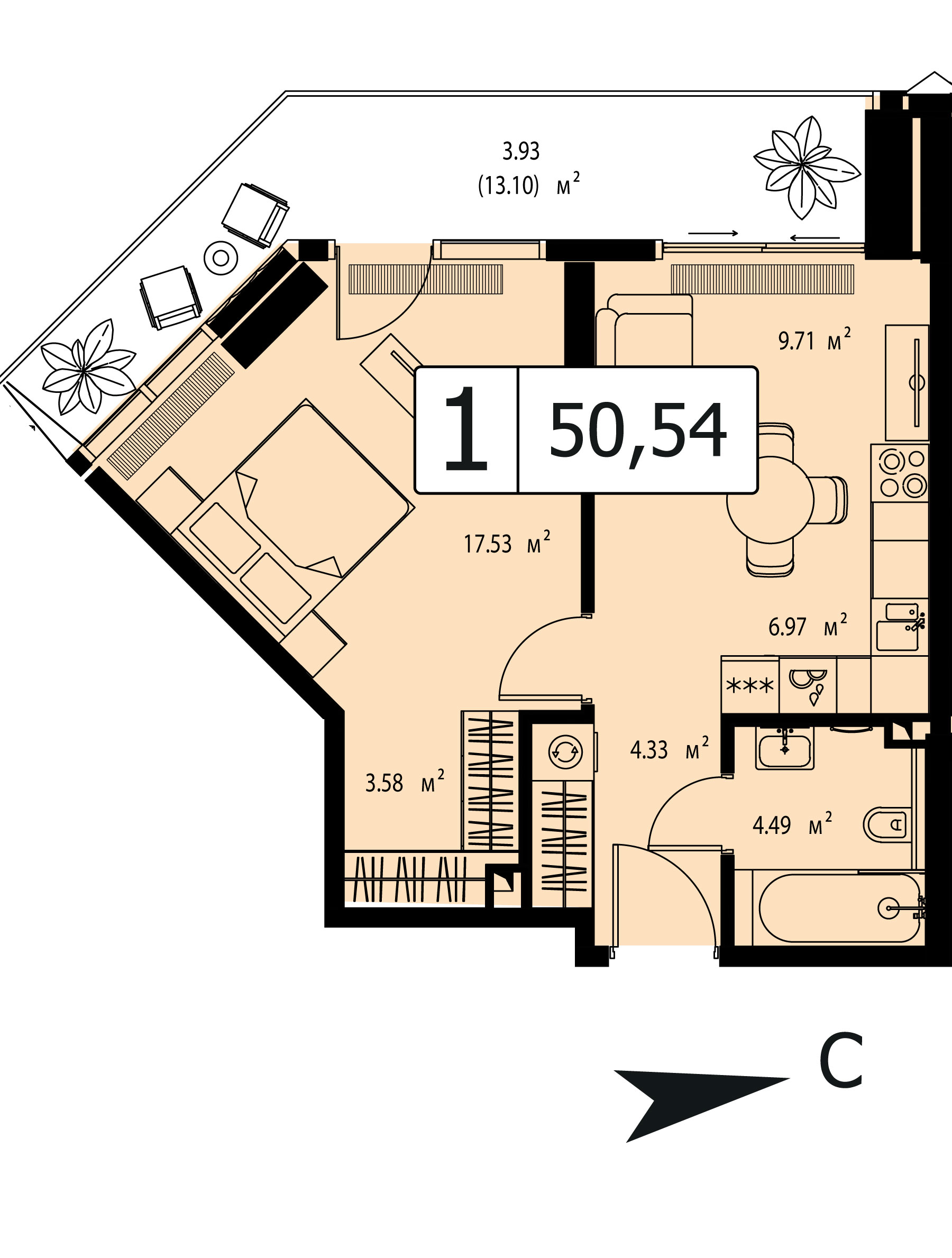 Однокомнатная квартира №15006, 54.79 м², 50 этаж, «JOIS» (Джойс)