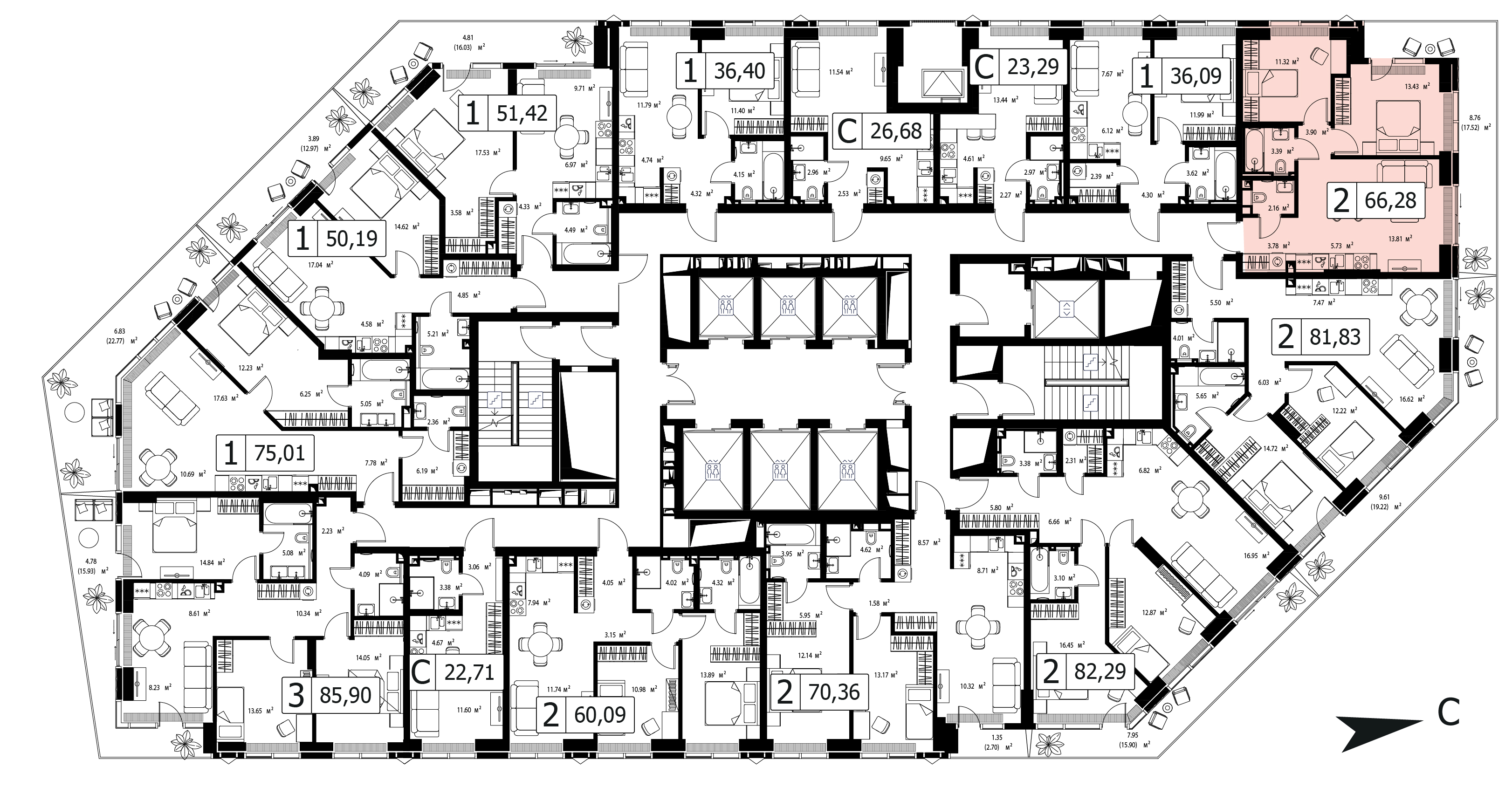 Двухкомнатная квартира №11611, 66.72 м², 16 этаж, «JOIS» (Джойс)