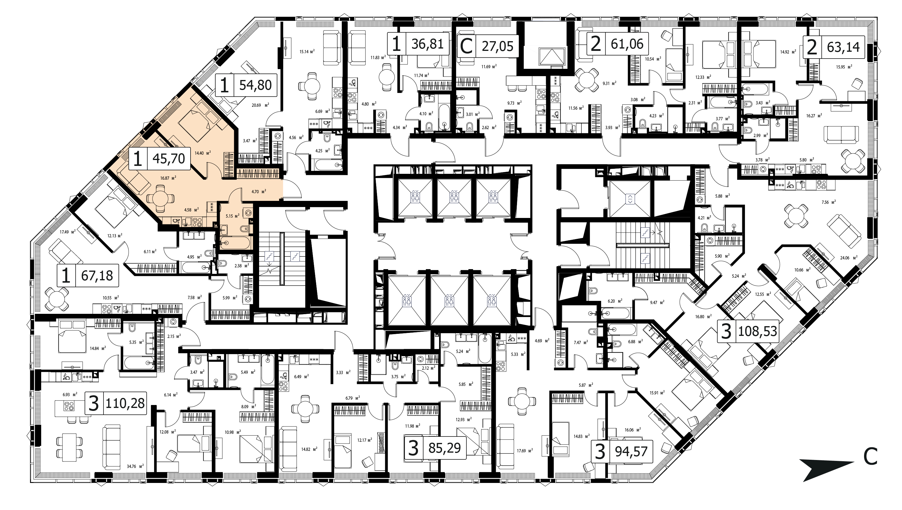 Однокомнатная квартира №15304, 45.71 м², 53 этаж, «JOIS» (Джойс)