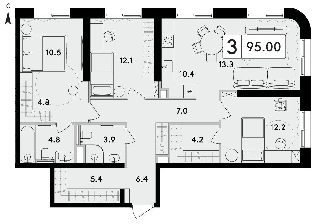 Трехкомнатная квартира №33, 94.5 м², 5 этаж, Жилой комплекс «SOKOLNIKI» (Сокольники)