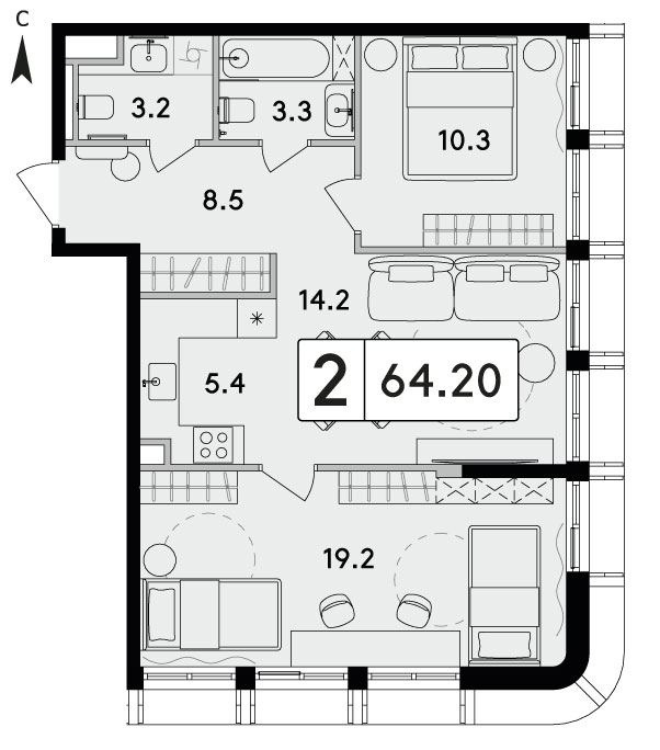 Двухкомнатная квартира №230, 65 м², 24 этаж, Жилой комплекс «SOKOLNIKI» (Сокольники)