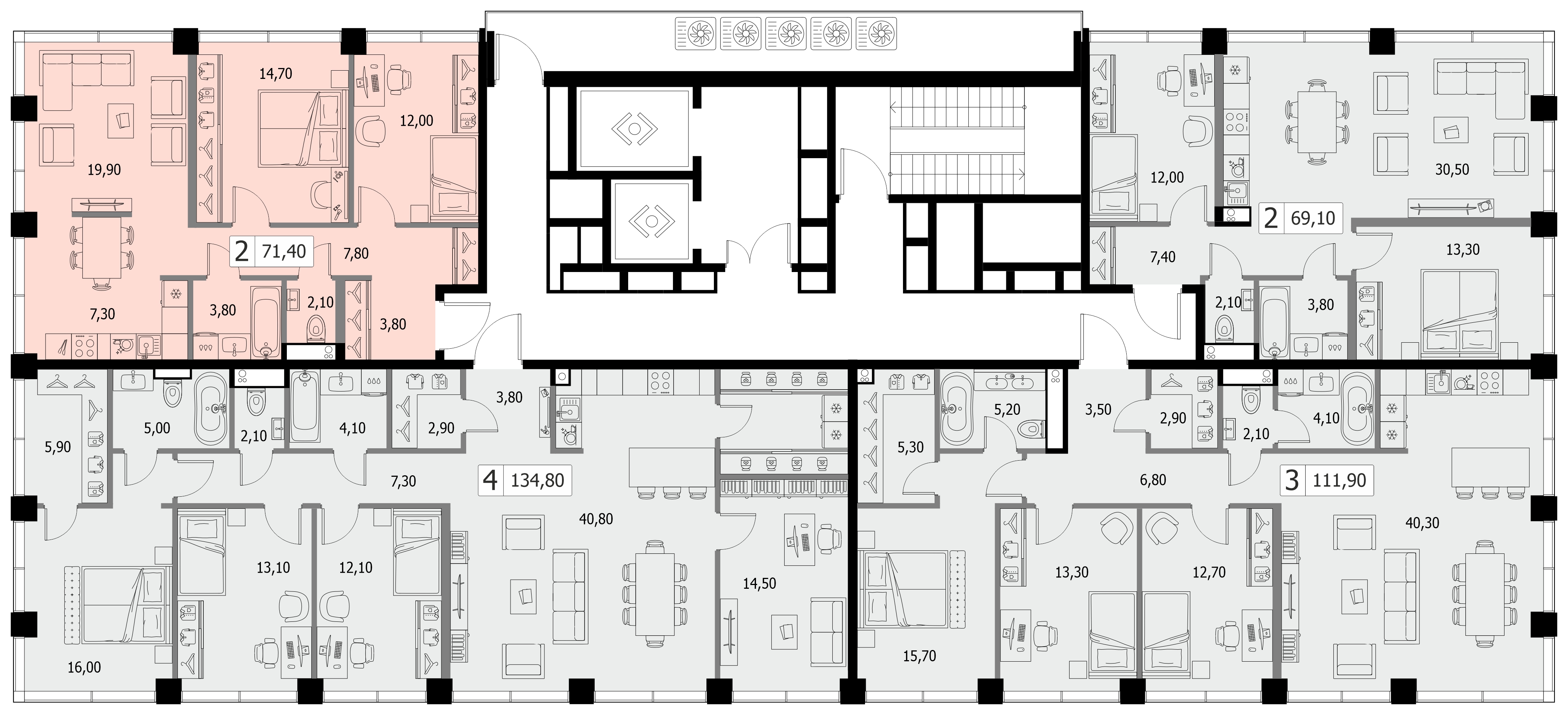 Двухкомнатная квартира №1140, 69.1 м², 11 этаж, Жилой комплекс «Северный порт»