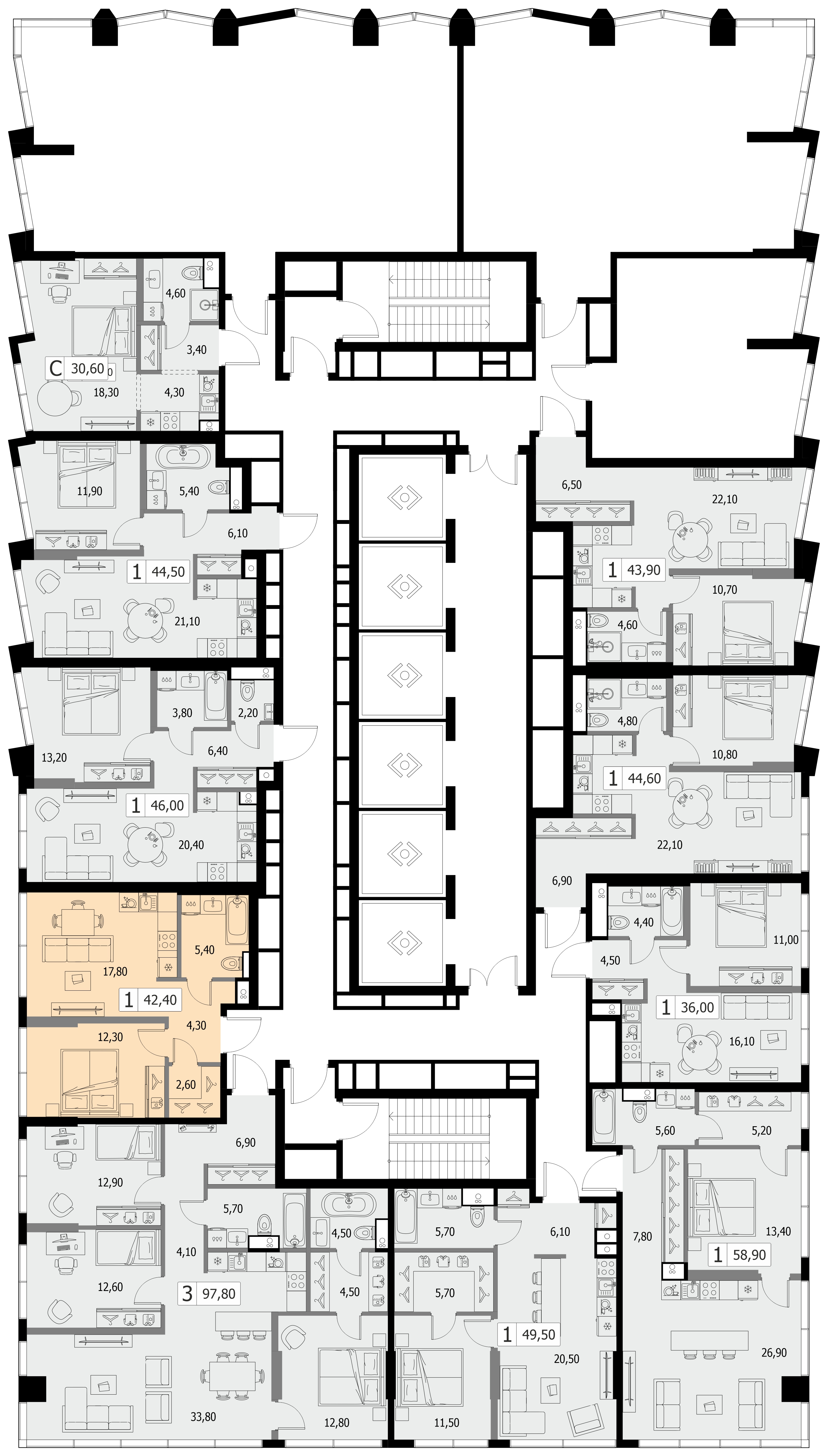 Однокомнатная квартира №336, 44.5 м², 29 этаж, Жилой комплекс «Северный порт»