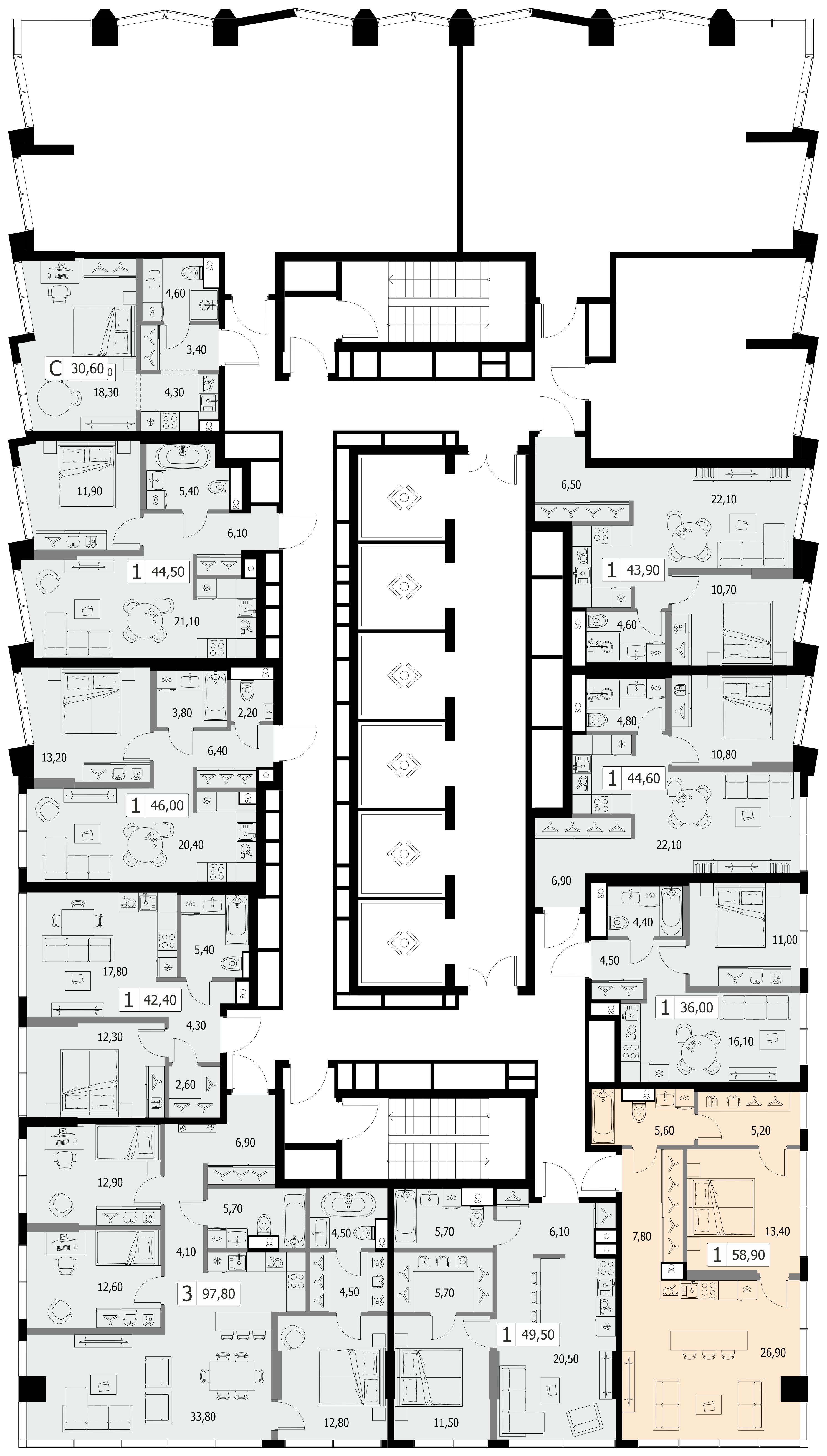 Однокомнатная квартира №393, 42.7 м², 33 этаж, Жилой комплекс «Северный порт»