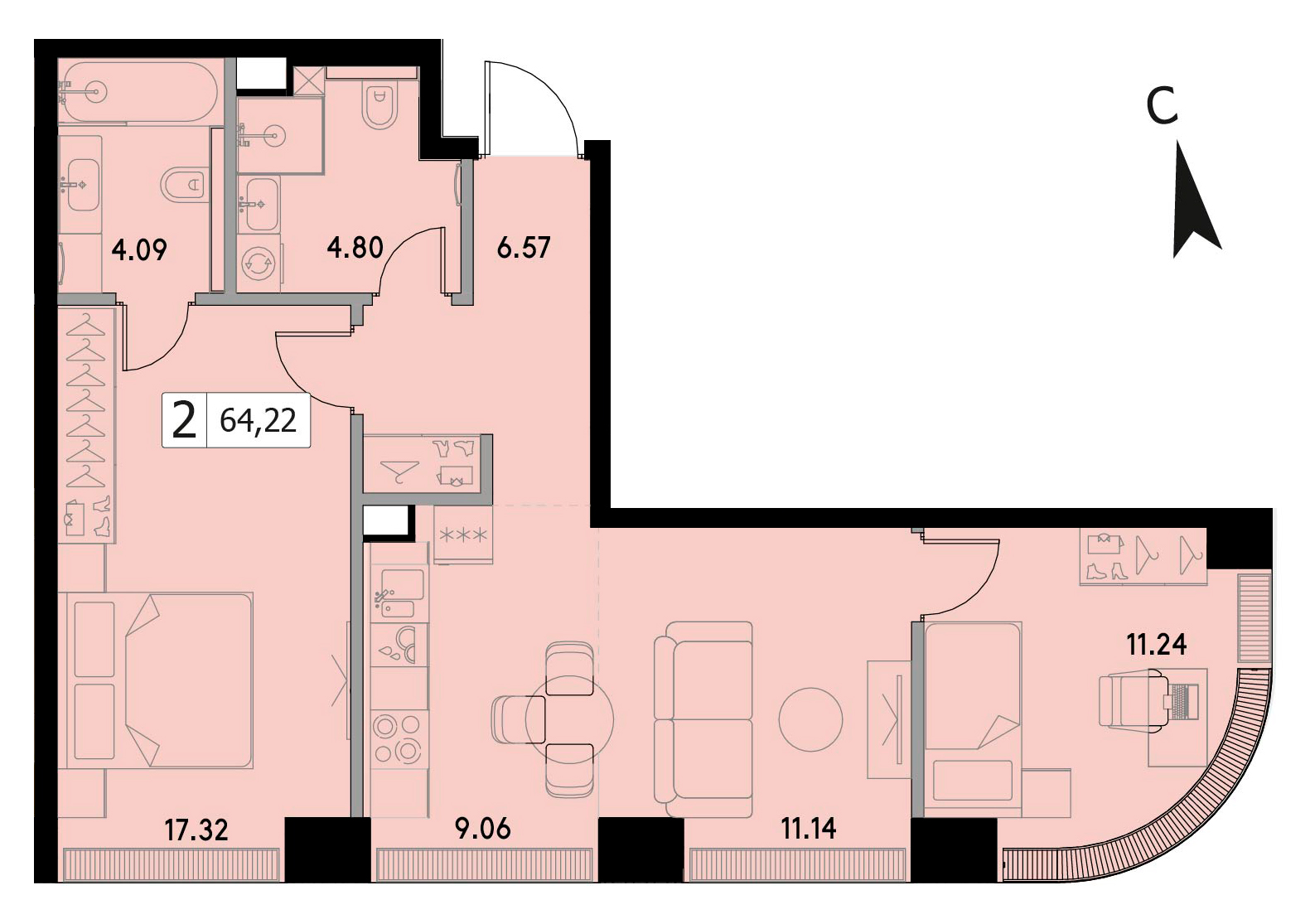 Двухкомнатная квартира 65.97 м², 29 этаж, ЖК «ВЕЕР» (VEER)