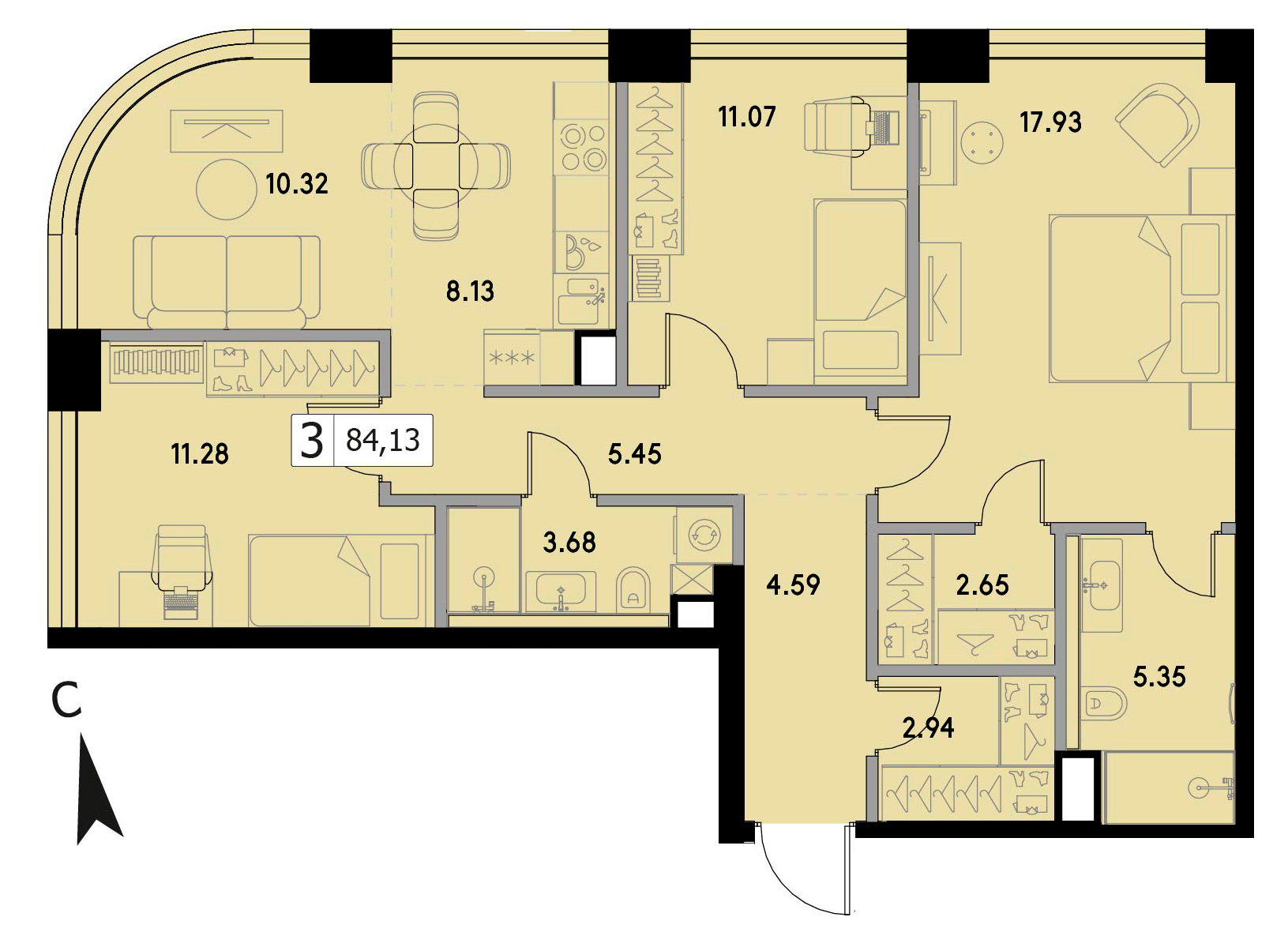 Трехкомнатная квартира 85.35 м², 23 этаж, ЖК «ВЕЕР» (VEER)