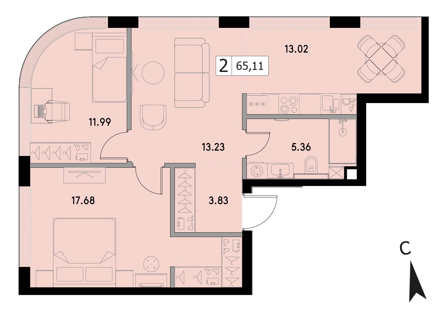 Двухкомнатная квартира 68.51 м², 54 этаж, ЖК «ВЕЕР» (VEER)