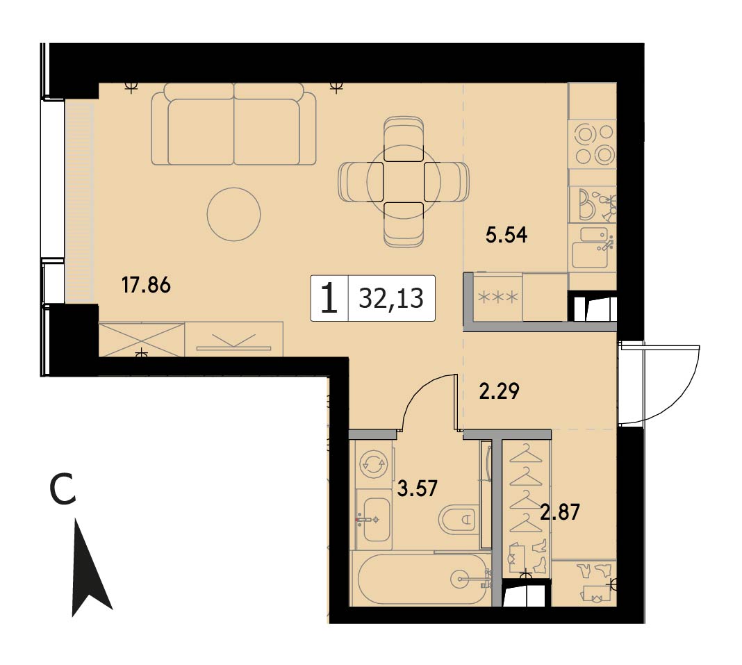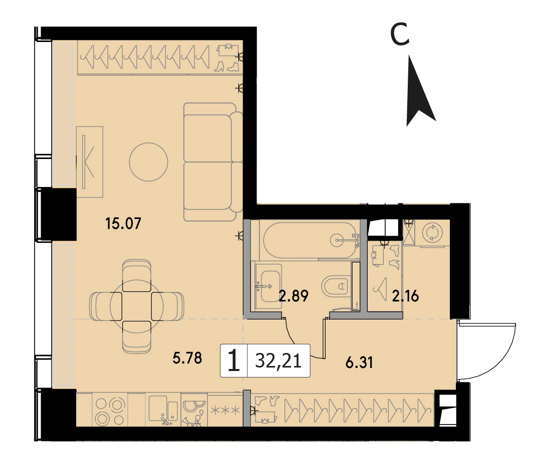 Однокомнатная квартира 32.14 м², 14 этаж, ЖК «ВЕЕР» (VEER)
