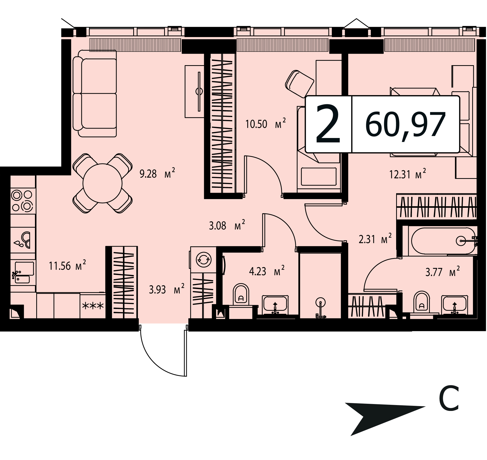 Двухкомнатная квартира 60.98 м², 31 этаж, ЖК «ДЖОЙС» (JOIS)