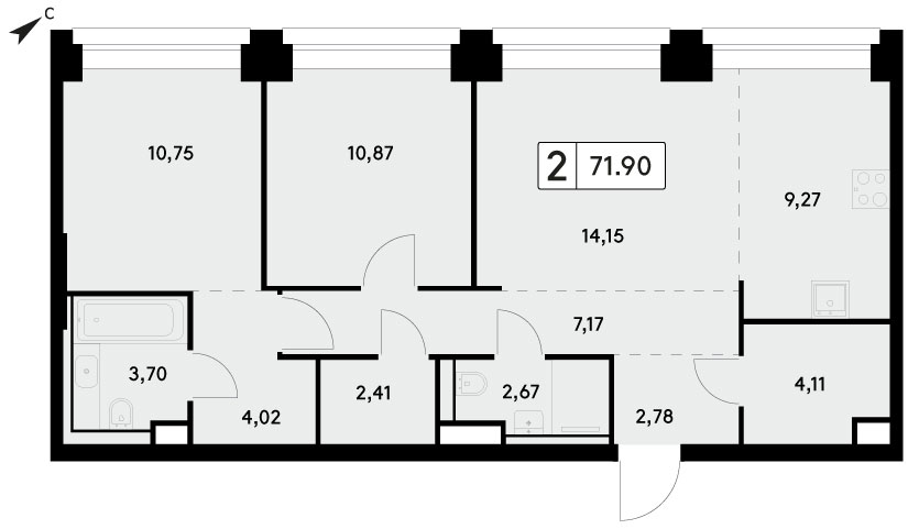 Двухкомнатная квартира №598, 67.5 м², 19 этаж, Жилой комплекс «NOVA» (Нова)