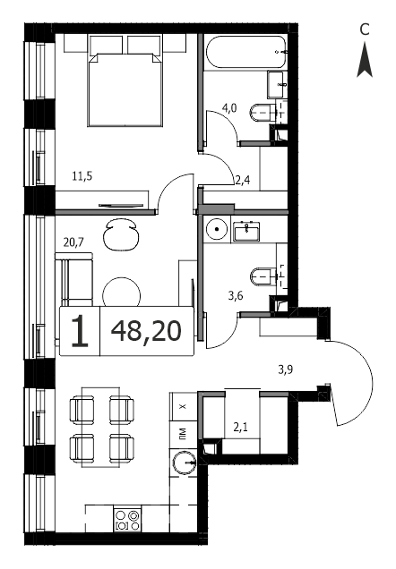 Однокомнатная квартира №2102, 49.7 м², 10 этаж, Жилой комплекс «Дом 7 Даниловский»