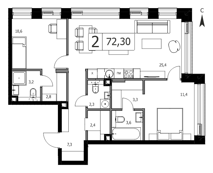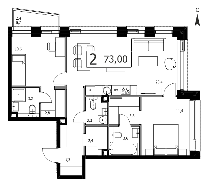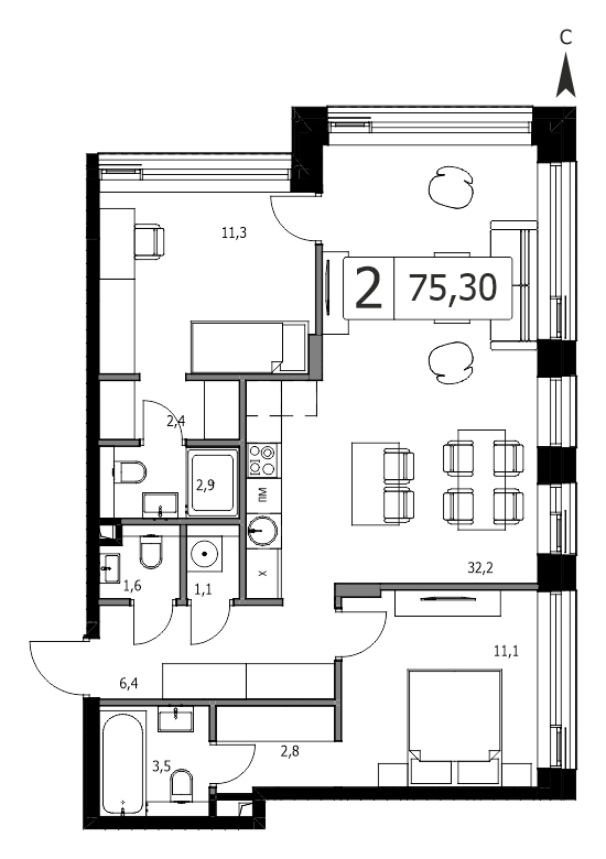 Двухкомнатная квартира №2135, 75.3 м², 13 этаж, Жилой комплекс «Дом 7 Даниловский»