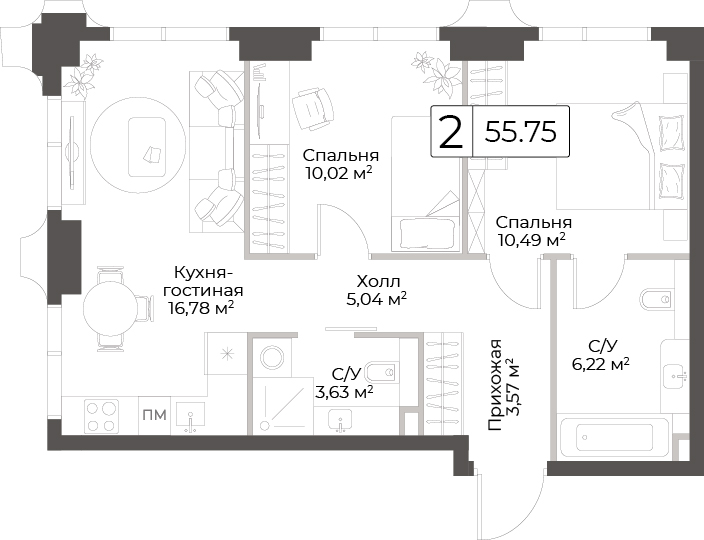 Комфортная двухкомнатная квартира квартира площадью 55.37 м² без отделки. Лот расположен на 4 этаже, корпуса 1 Клубный дом «Гранд Фили».Комплекс находится по адресу: г. Москва, Большая Филевская, 2, срок сдачи 2028г.. Это соединение удобной инфраструктуры городской застройки и зеленых зон отдыха.