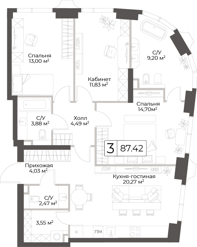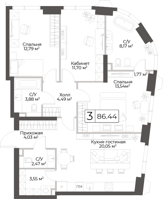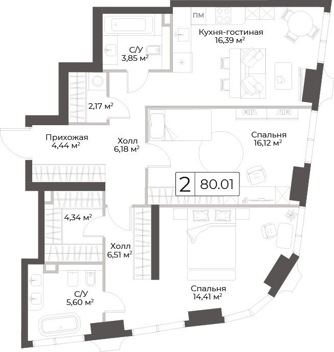 Двухкомнатная квартира 82.47 м², 4 этаж, Клубный дом «Гранд Фили»