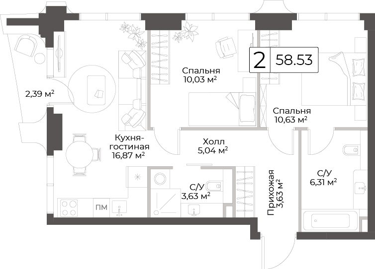 58.5 м²