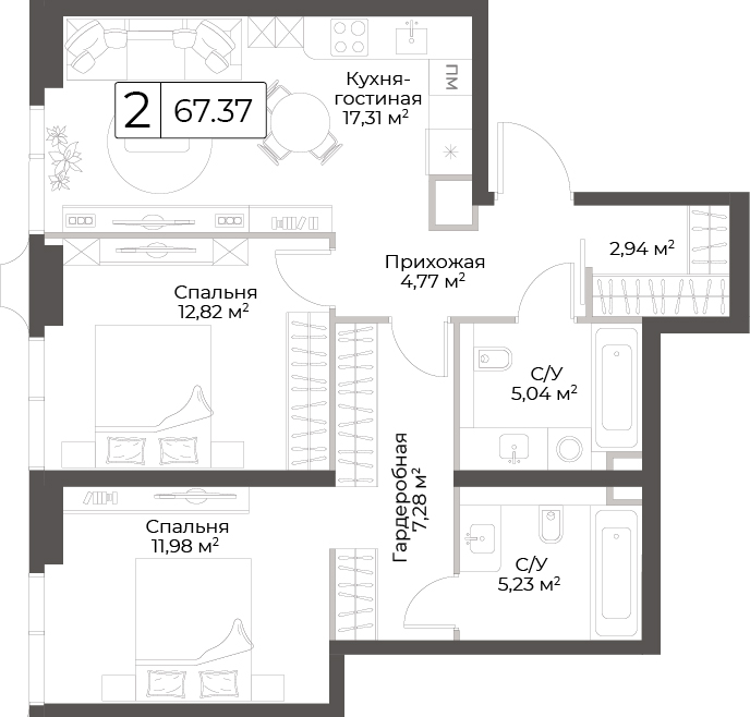 Комфортная двухкомнатная квартира квартира площадью 69.99 м² без отделки. Лот расположен на 18 этаже, корпуса 1 Клубный дом «Гранд Фили».Комплекс находится по адресу: г. Москва, Большая Филевская, 2, срок сдачи 2028г.. Это соединение удобной инфраструктуры городской застройки и зеленых зон отдыха.