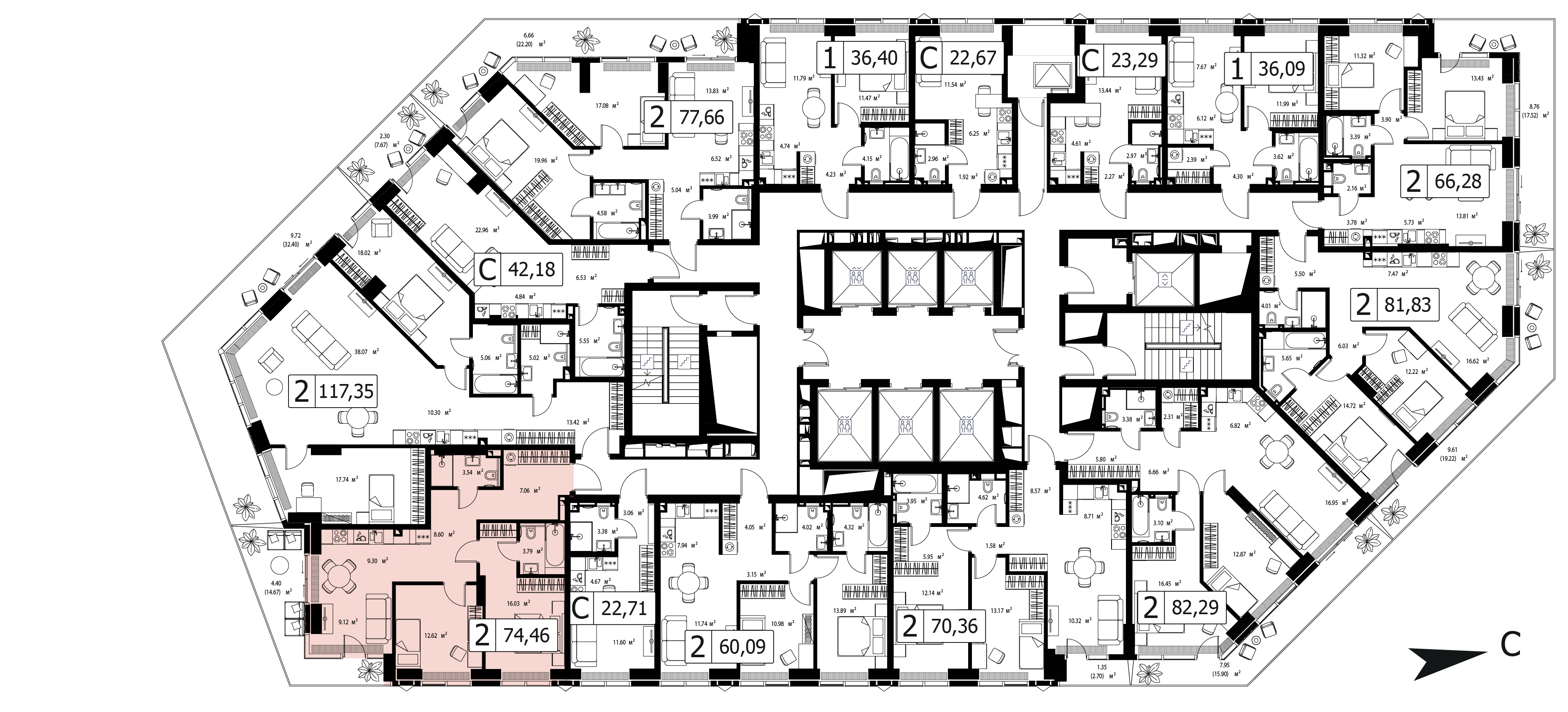 Двухкомнатная квартира 74.46 м², 14 этаж, «JOIS» (Джойс)