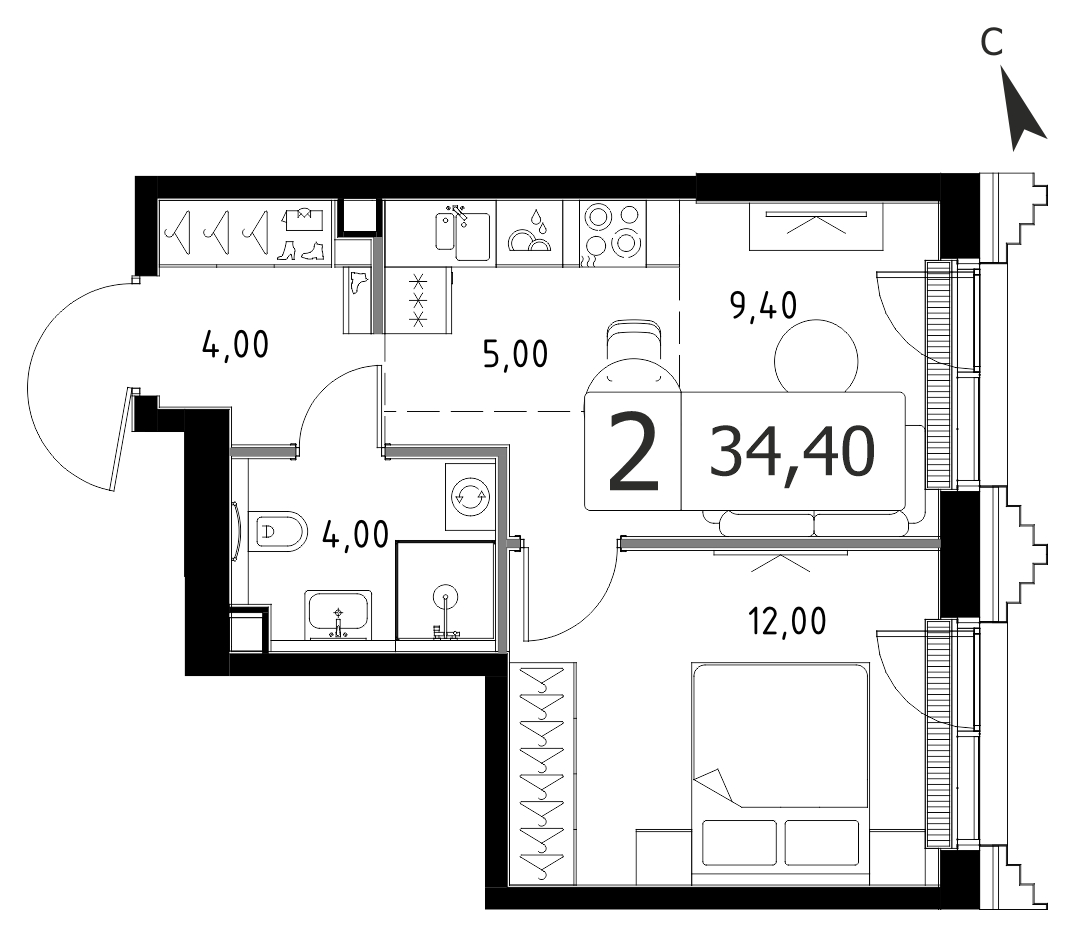 Двухкомнатная квартира 34.4 м², 3 этаж, ЖК «СЕТ» (SET)