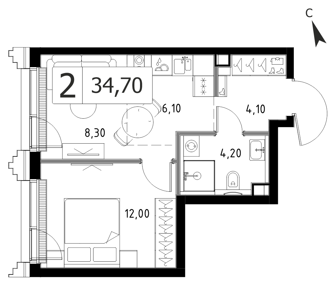 Двухкомнатная квартира 34.7 м², 49 этаж, ЖК «СЕТ» (SET)