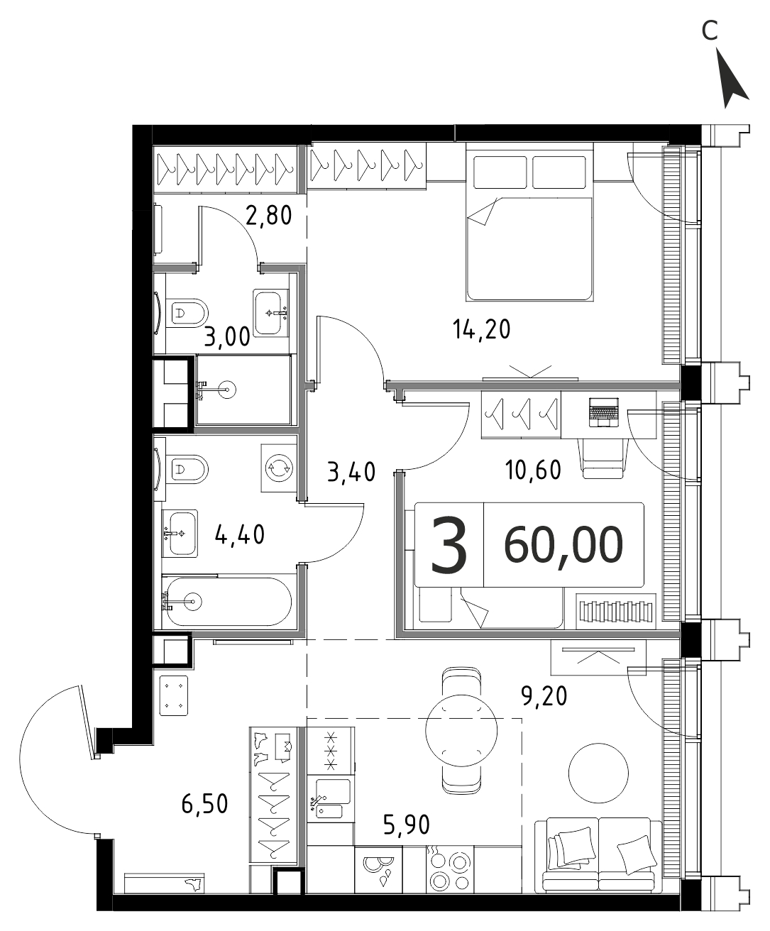 Комфортная трехкомнатная квартира квартира площадью 60 м² без отделки. Лот расположен на 51 этаже, корпуса 2 ЖК «СЕТ» (SET).Комплекс находится по адресу: г. Москва, ул. Верейская, срок сдачи 2028г.. Это соединение удобной инфраструктуры городской застройки и зеленых зон отдыха.