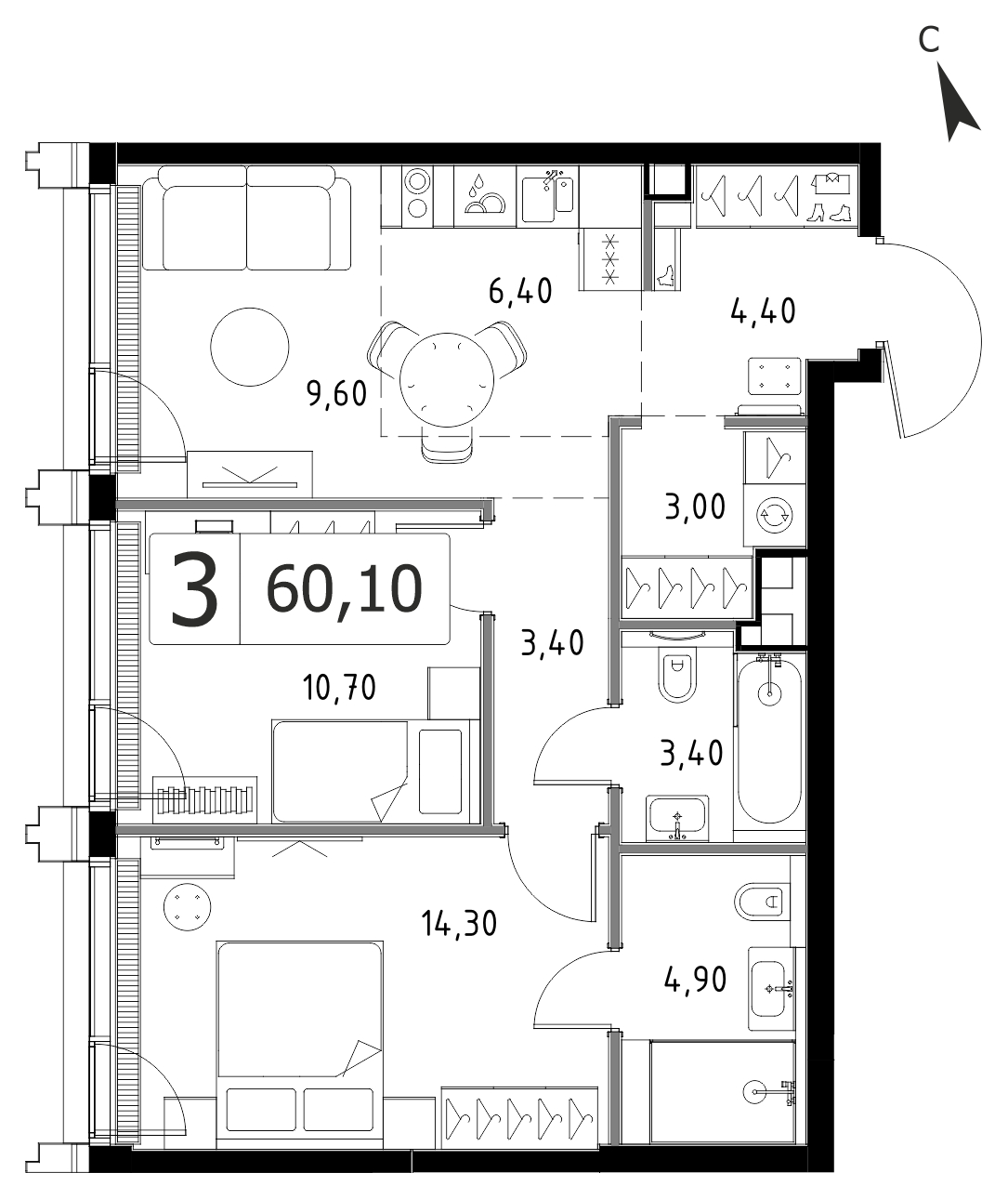 Трехкомнатная квартира 60.1 м², 51 этаж, ЖК «СЕТ» (SET)