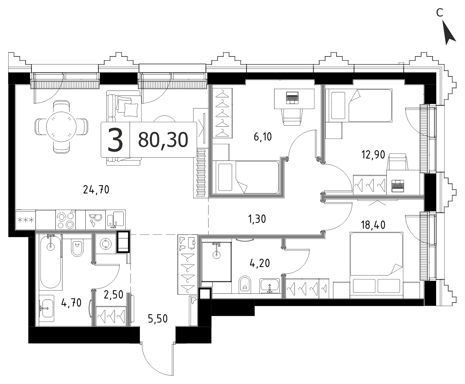Трехкомнатная квартира 80.25 м², 14 этаж, ЖК «СЕТ» (SET)