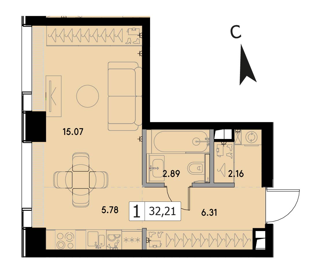 Однокомнатная квартира 30.72 м², 27 этаж, ЖК «ВЕЕР» (VEER)