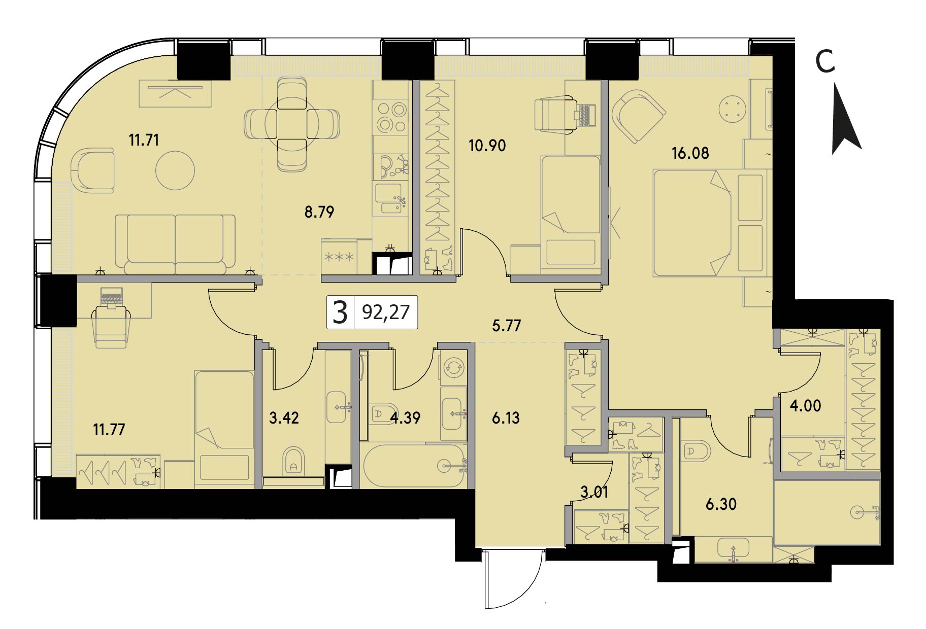 Трехкомнатная квартира 92.27 м², 12 этаж, ЖК «ВЕЕР» (VEER)