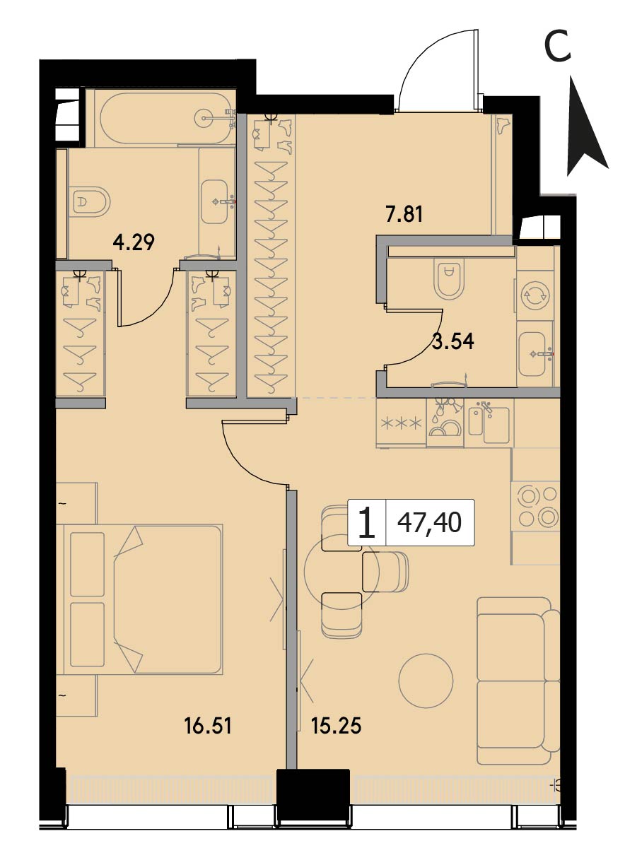 Однокомнатная квартира 47.86 м², 36 этаж, ЖК «ВЕЕР» (VEER)