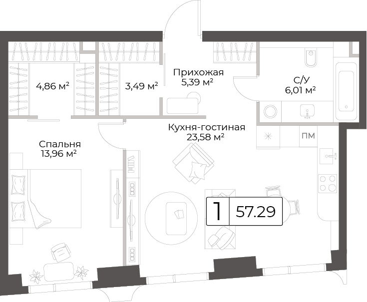 Однокомнатная квартира 53.35 м², 6 этаж, Клубный дом «Гранд Фили»