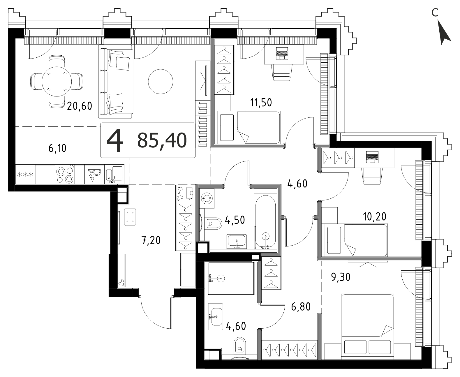 Четырехкомнатная квартира 85.6 м², 43 этаж, ЖК «СЕТ» (SET)