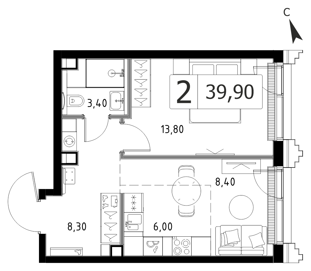 Двухкомнатная квартира 39.1 м², 34 этаж, ЖК «СЕТ» (SET)